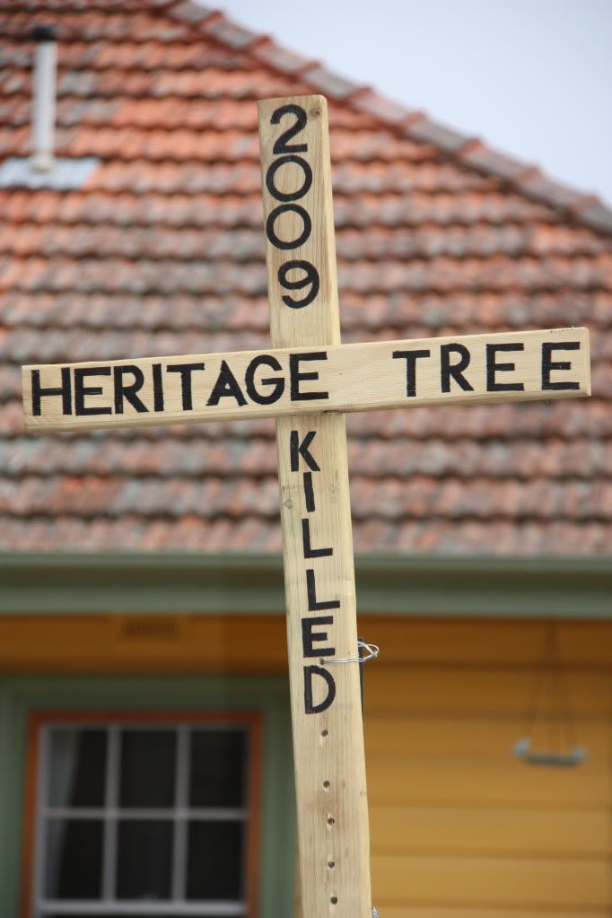 The commemorative cross saying Heritage tree, killed 2009.